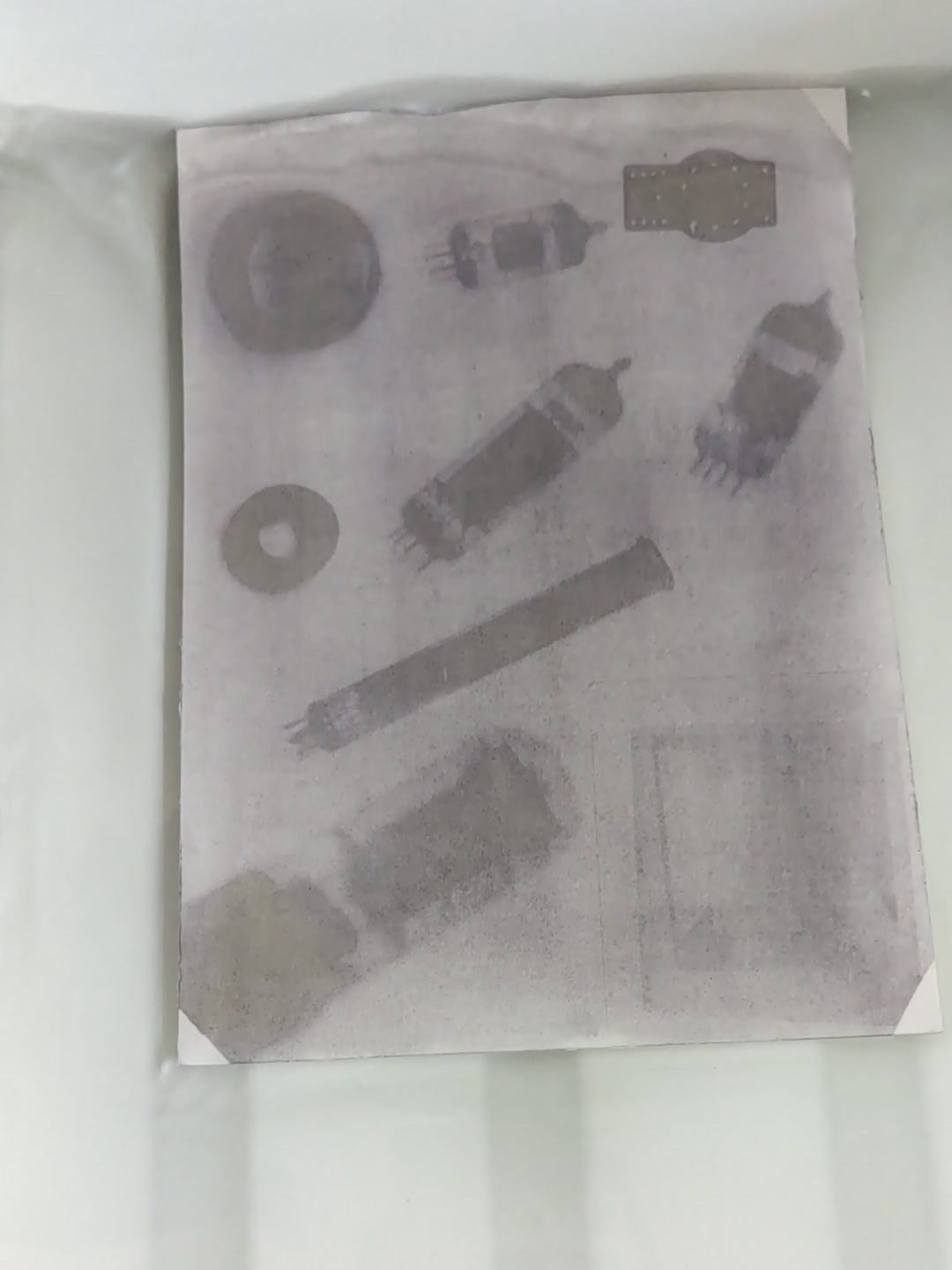 When immersing the exposed image in the developer the gallic acid reacts with the iron, forming light and soluble ferrogallate everywhere the image was exposed and dark and insoluble ferrigallate wherever the image wasn’t exposed.