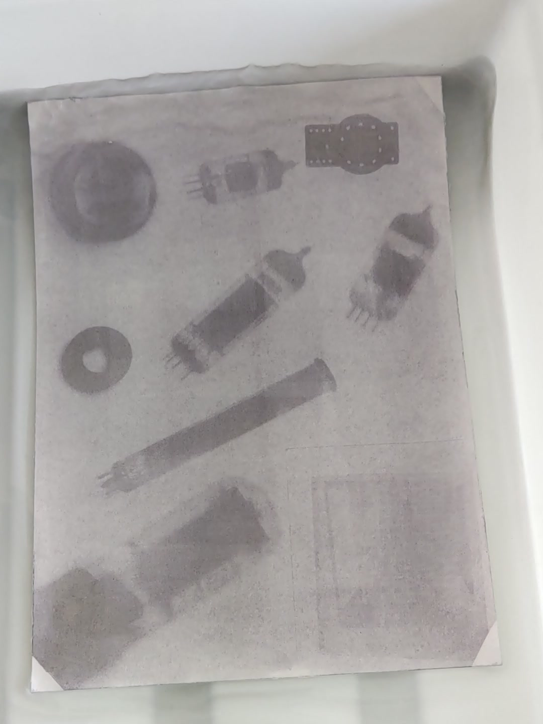 For my experiments I decided to make simple photograms since I felt the idea of capturing an object’s shadow as a positive fit very well with the æsthetic of the process. The images were exposed for 15 minutes using a 1000W halogen spotlight. A UV light or exposure box works as well and can results in exposure times as low as 5 minutes, but I preferred the sharper shadows and higher contrast I got from the spotlight.