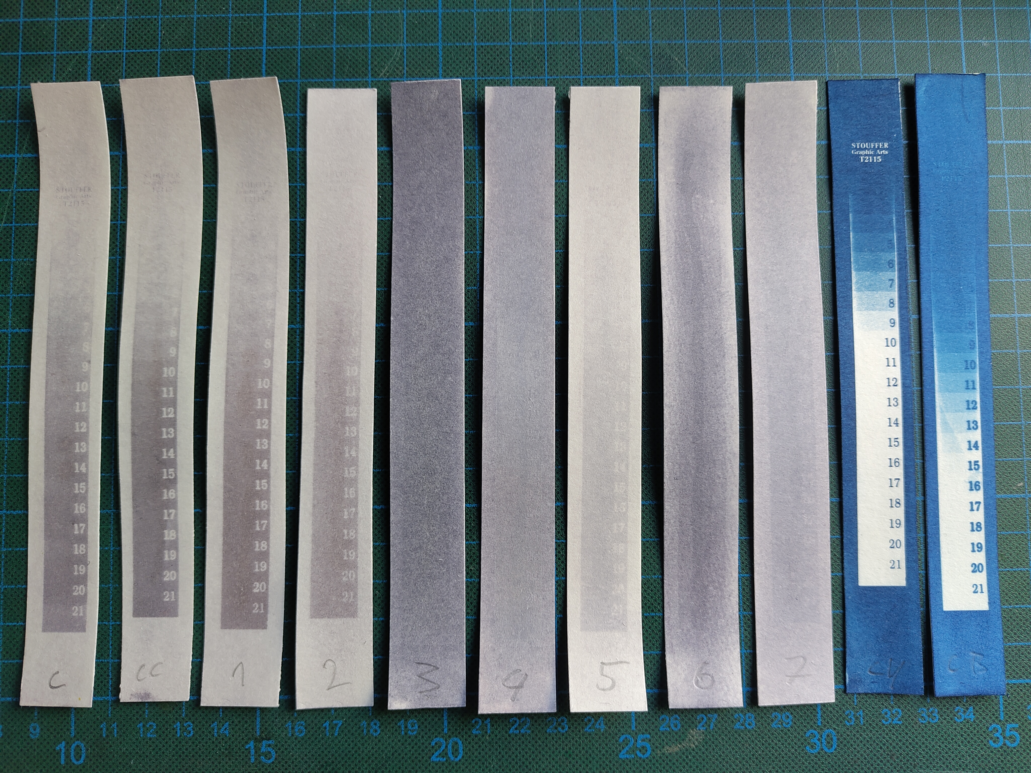 The sensitizer as described by Colas is relatively dilute7, but as opposed to a negative process where increasing the concentration of the sensitizer makes it more sensitive the opposite happens here. Since the iron(III) in the sensitzer needs to be fully reduced to get the highlights of the image to clear increasing the concentration leads to a lower sensitivity while proportionally increasing the contrast and density.