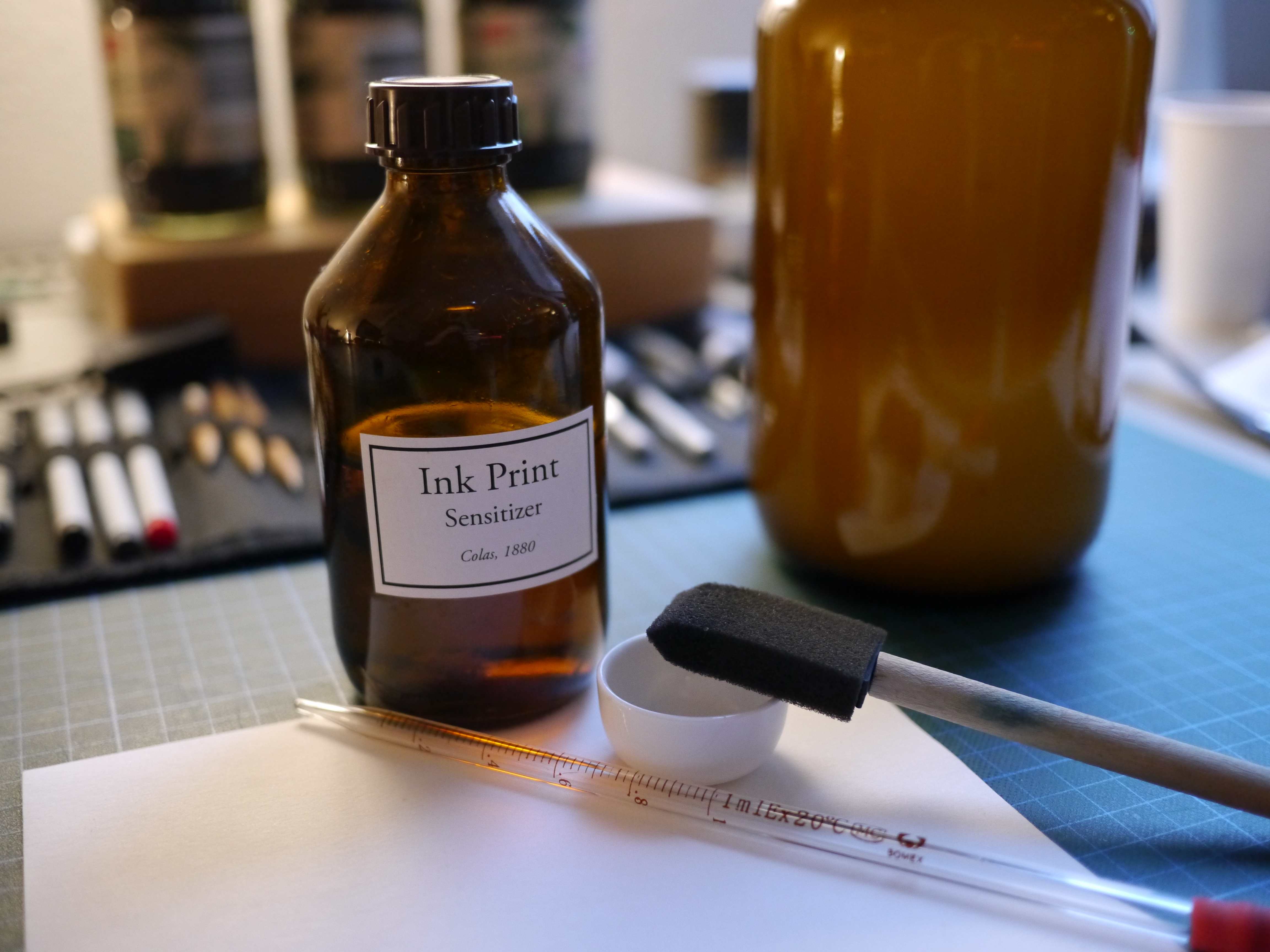 I prepared 250ml of the sensitizer and it seems to store well in a brown glass bottle when kept out of light. Keep in mind that this sensitizer is fairly acidic3, so it does somewhat attack the paper and gloves should be worn when handling it.